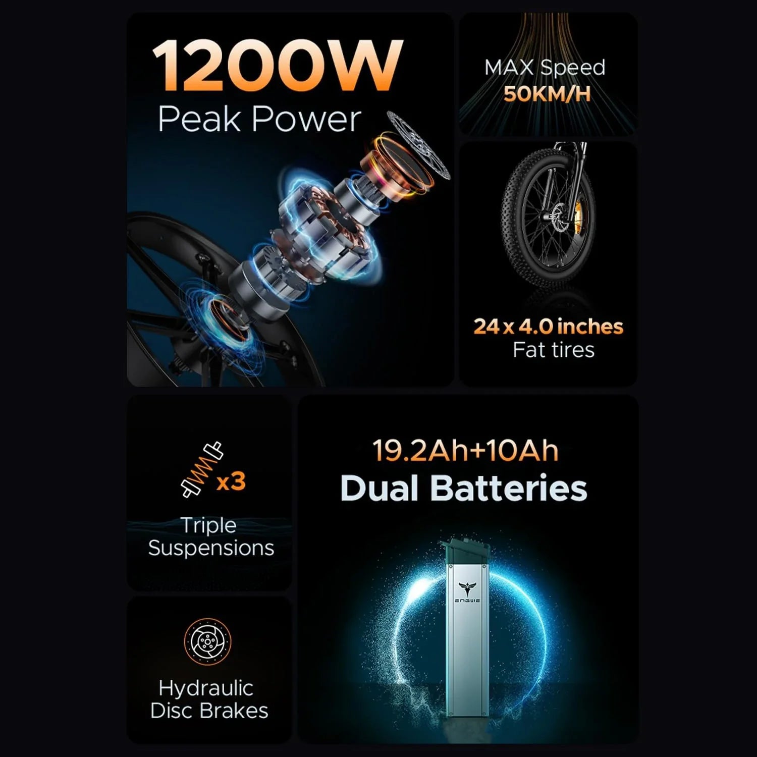Erleben Sie die Kraft und unaufhaltsame Geschwindigkeit des ENGWE Elektrofahrrads X24, einem beeindruckenden Elektro-Mountainbike mit einer Höchstgeschwindigkeit von 50 km/h und einer atemberaubenden Maximalleistung von 1200 W.