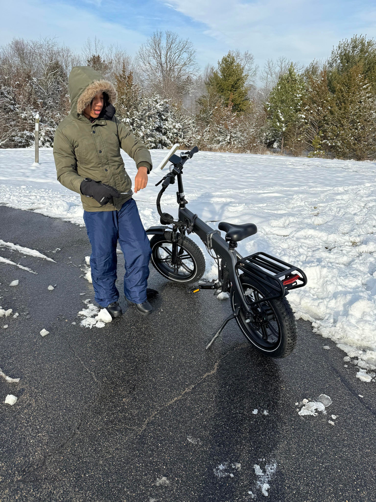 | Folded Dimension (LxWxH): 34" x 18" x 29" | Bike Weight (Battery Included): 42 lbs |